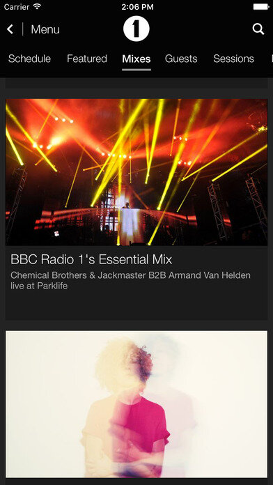 The queue icon (right) is always present throughout the app. The live broadcast shortcut (left) appears at all top level screens.